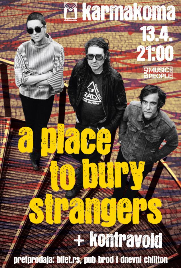 Popularni bruklinski prvaci modernog noise-rocka A Place To Bury Strangers vraćaju se u Beograd u ponedeljak, 13. aprila. Koncert će biti održan u klubu Karmakoma, a pre njih nastupiće Kontravoid iz Los Anđelesa.